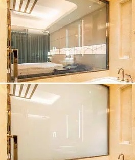 When electricity is off, the liquid crystals scatter light, making the glass appear opaque for instant privacy. When electricity is on, the crystals align, allowing light to pass through and the glass becomes clear.